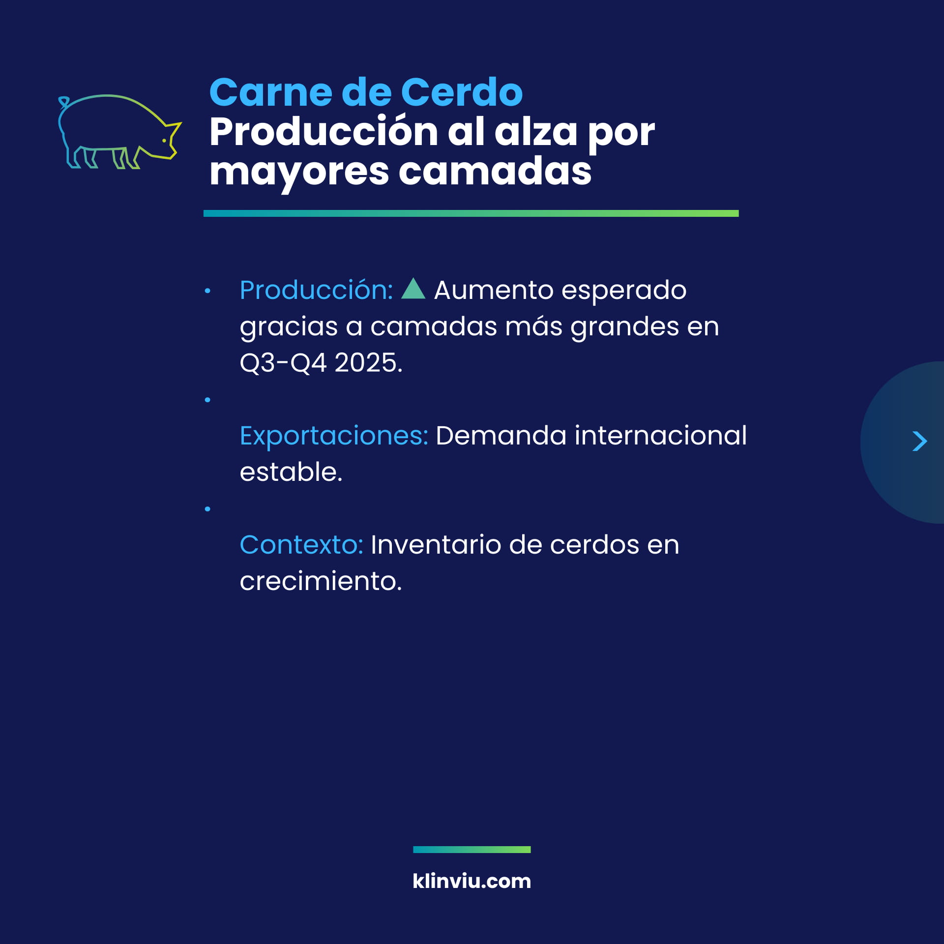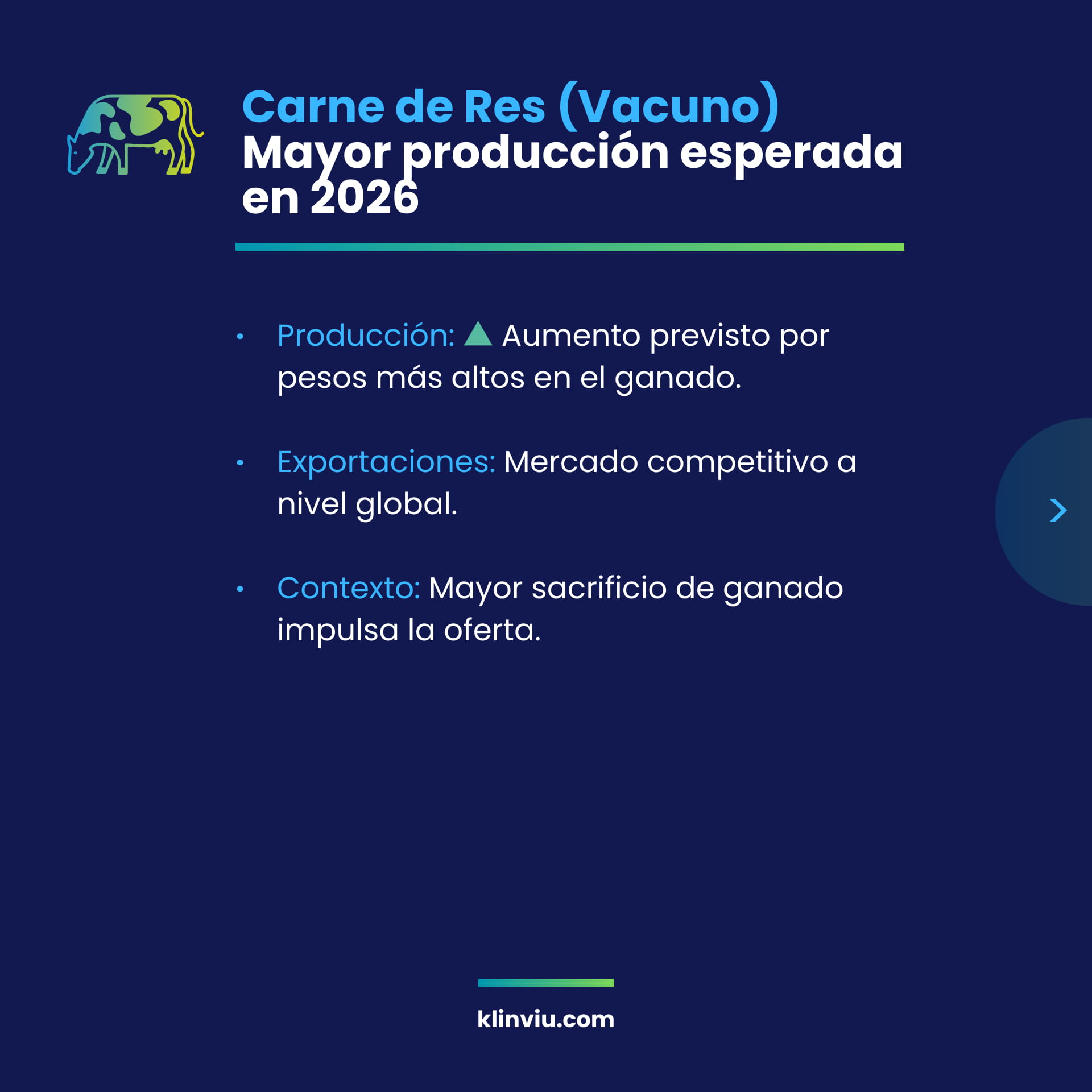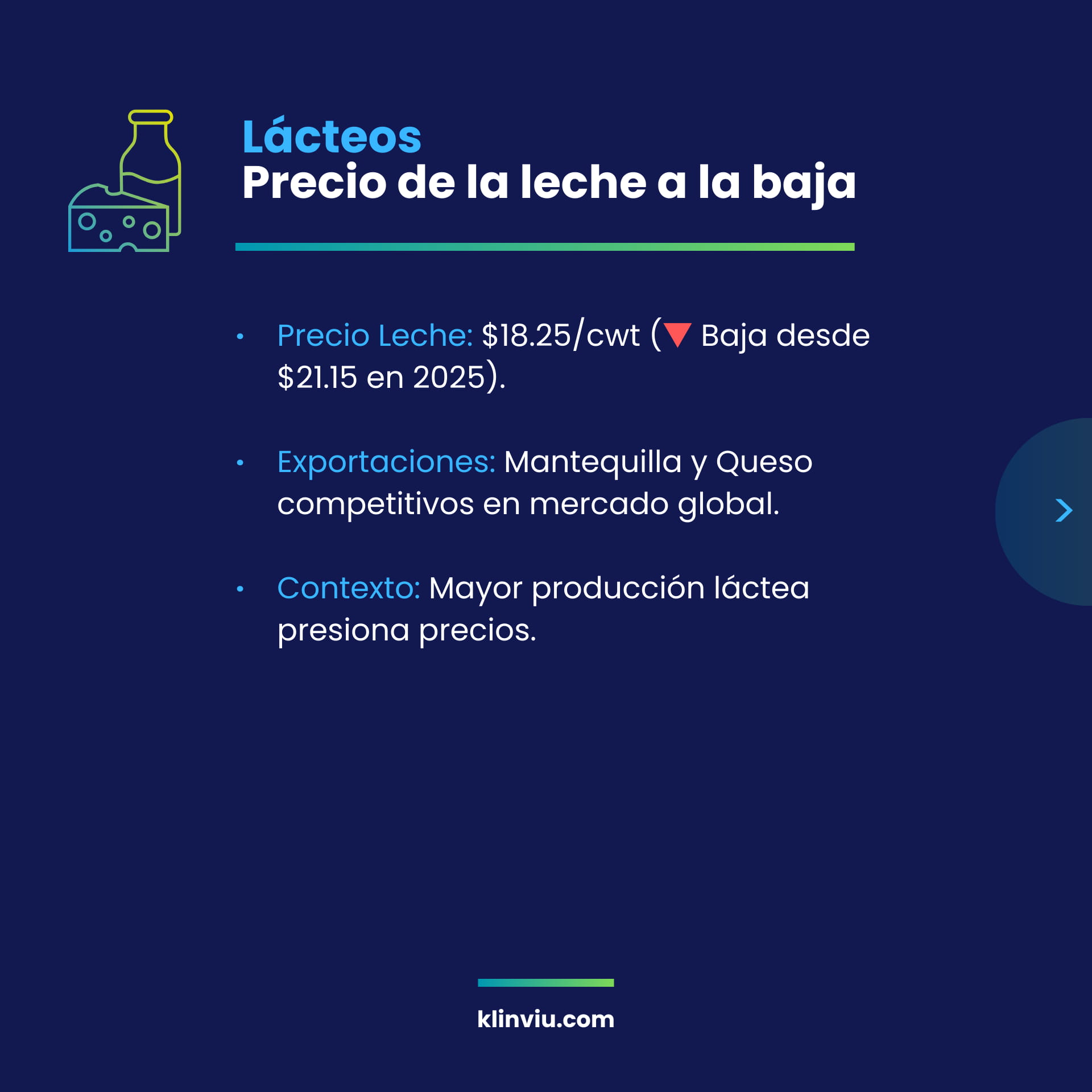 - Ganadería: Se espera mayor producción de carne de res y cerdo en 2026. El precio de la leche baja a $18.25/cwt desde $21.15.
