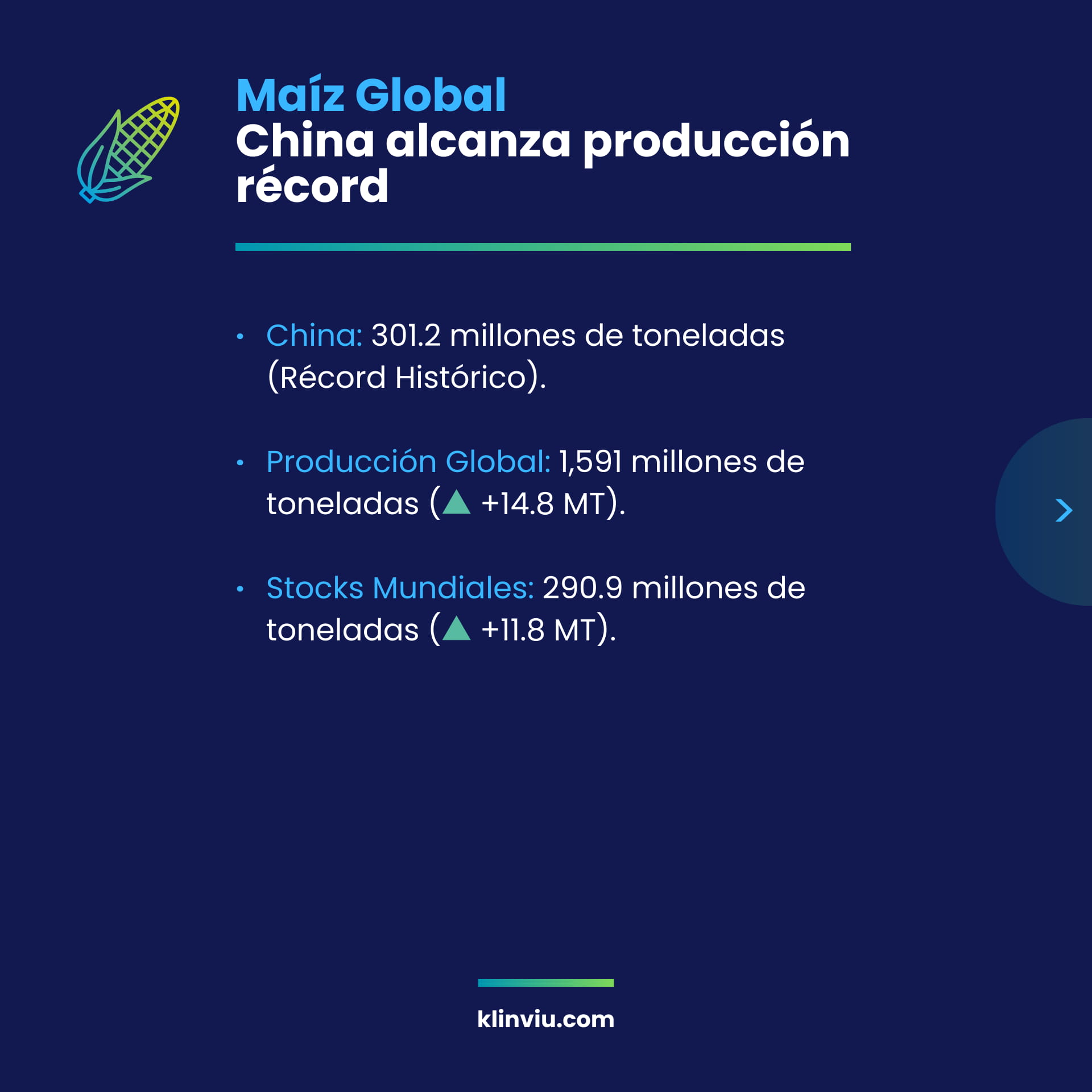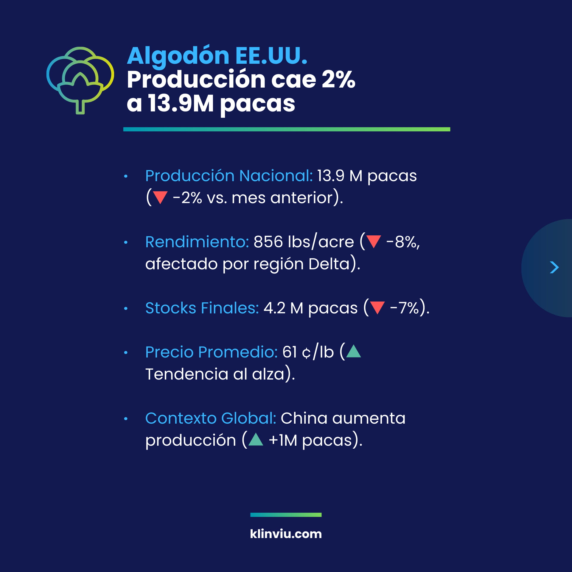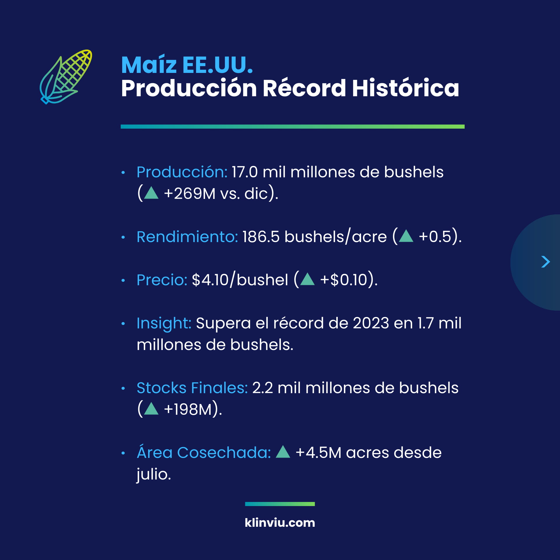 - Maíz: EE.UU. alcanza producción récord histórica con 17.0 mil millones de bushels, superando 2023 en 1.7B bu. China también marca récord con 301.2 MT.