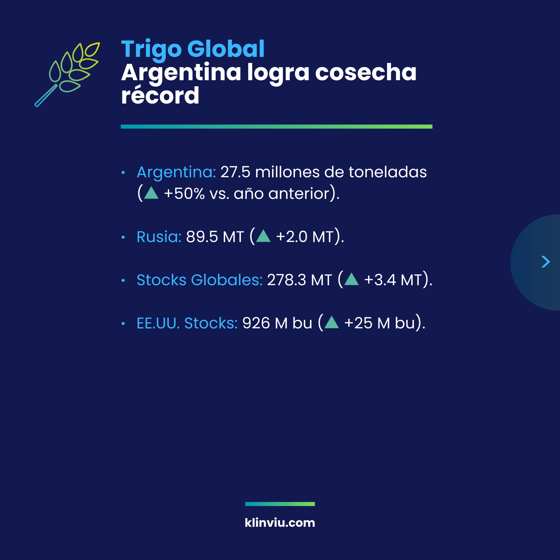 - Trigo: Argentina sorprende con una cosecha récord de 27.5 MT, un impresionante +50% respecto al año anterior.