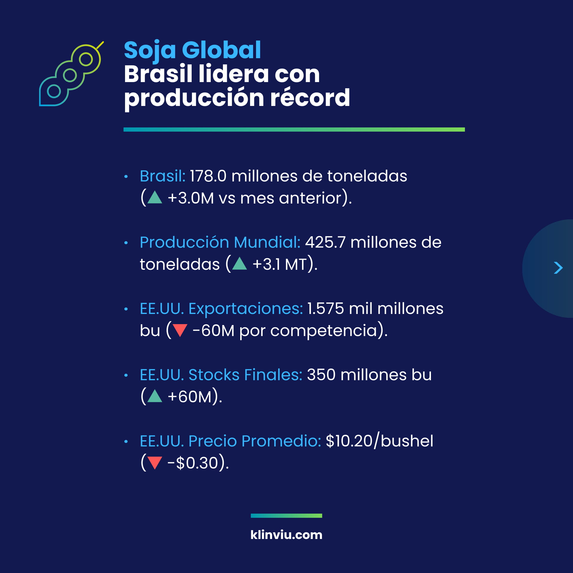 - Soja: Brasil lidera la producción mundial con 178.0 MT. Las exportaciones de EE.UU. caen 60M bu por la fuerte competencia sudamericana.