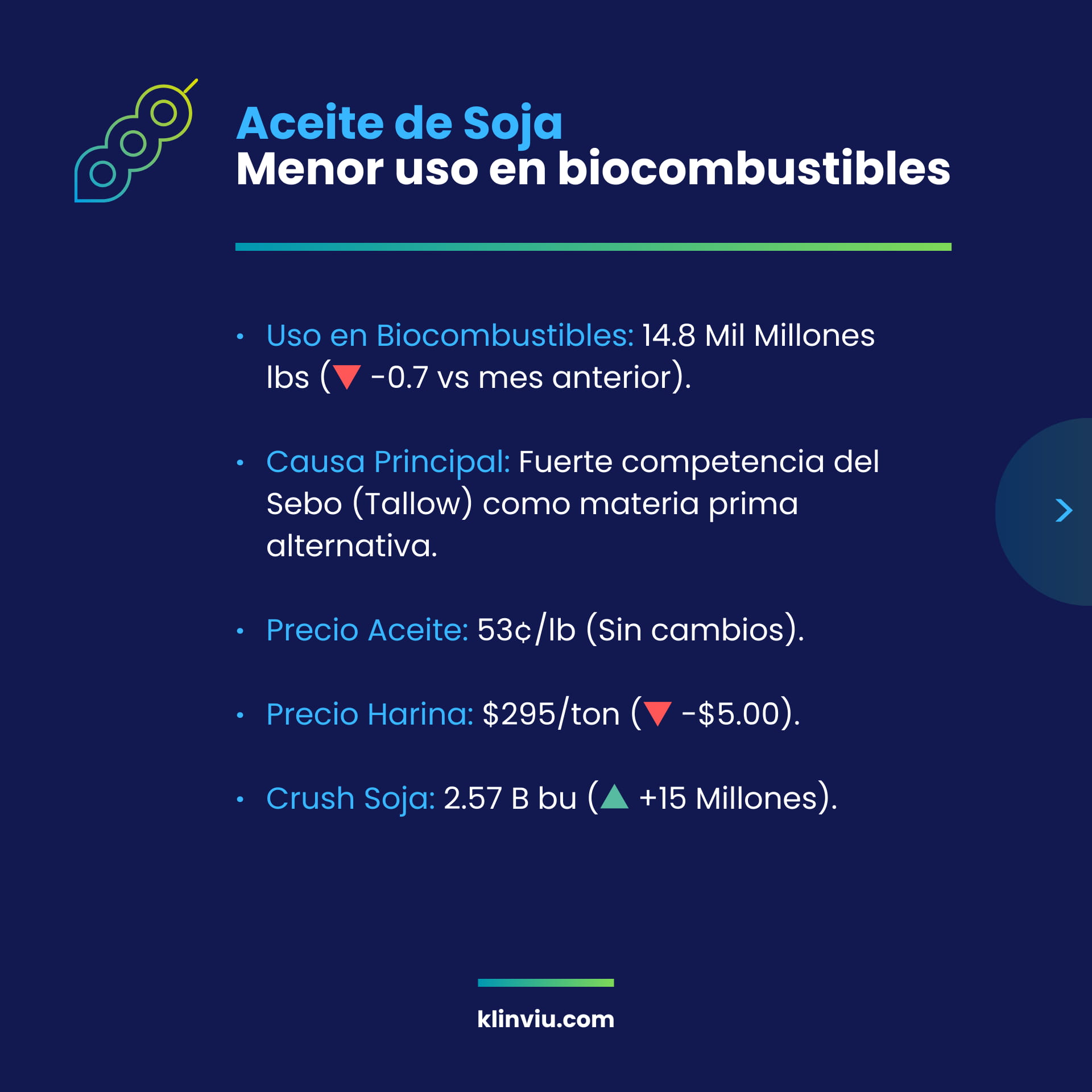 - Aceite de Soja: El uso en biocombustibles cae a 14.8B lbs por la competencia del sebo (tallow) como materia prima alternativa.