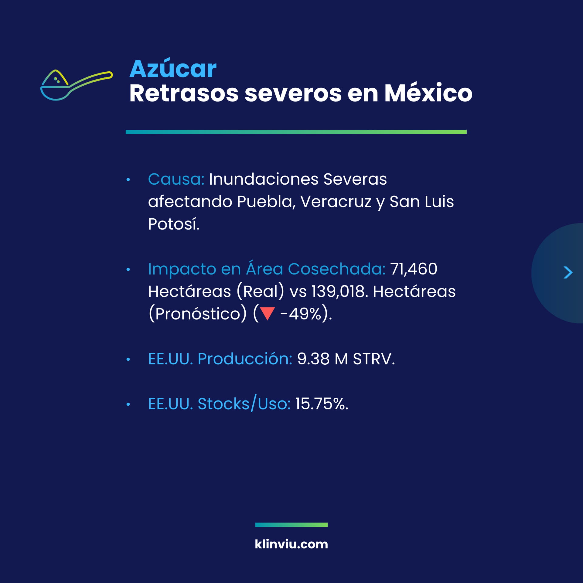 - Azúcar: México enfrenta retrasos severos en la cosecha por inundaciones. Solo se han cosechado 71,460 ha de las 139,018 ha previstas.
